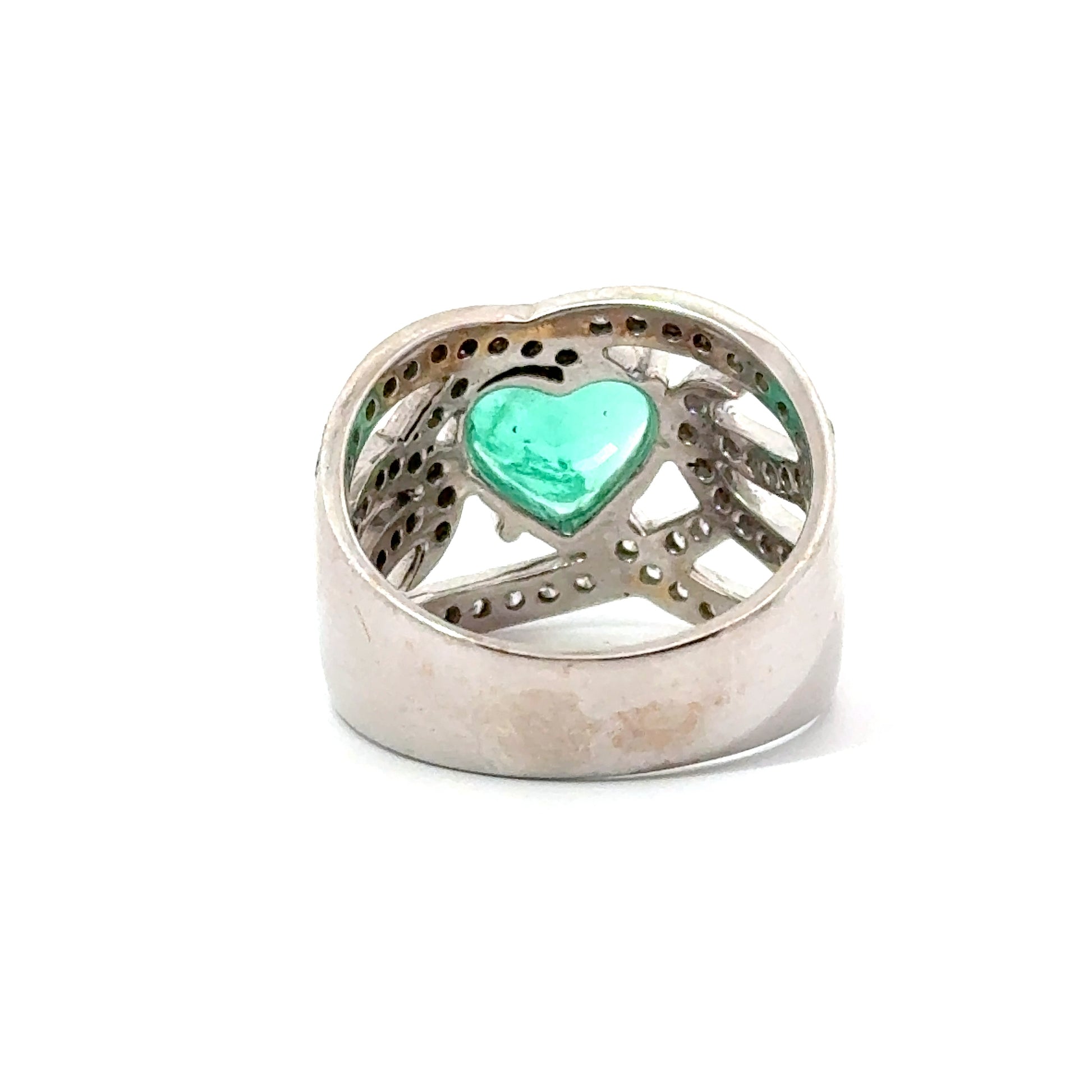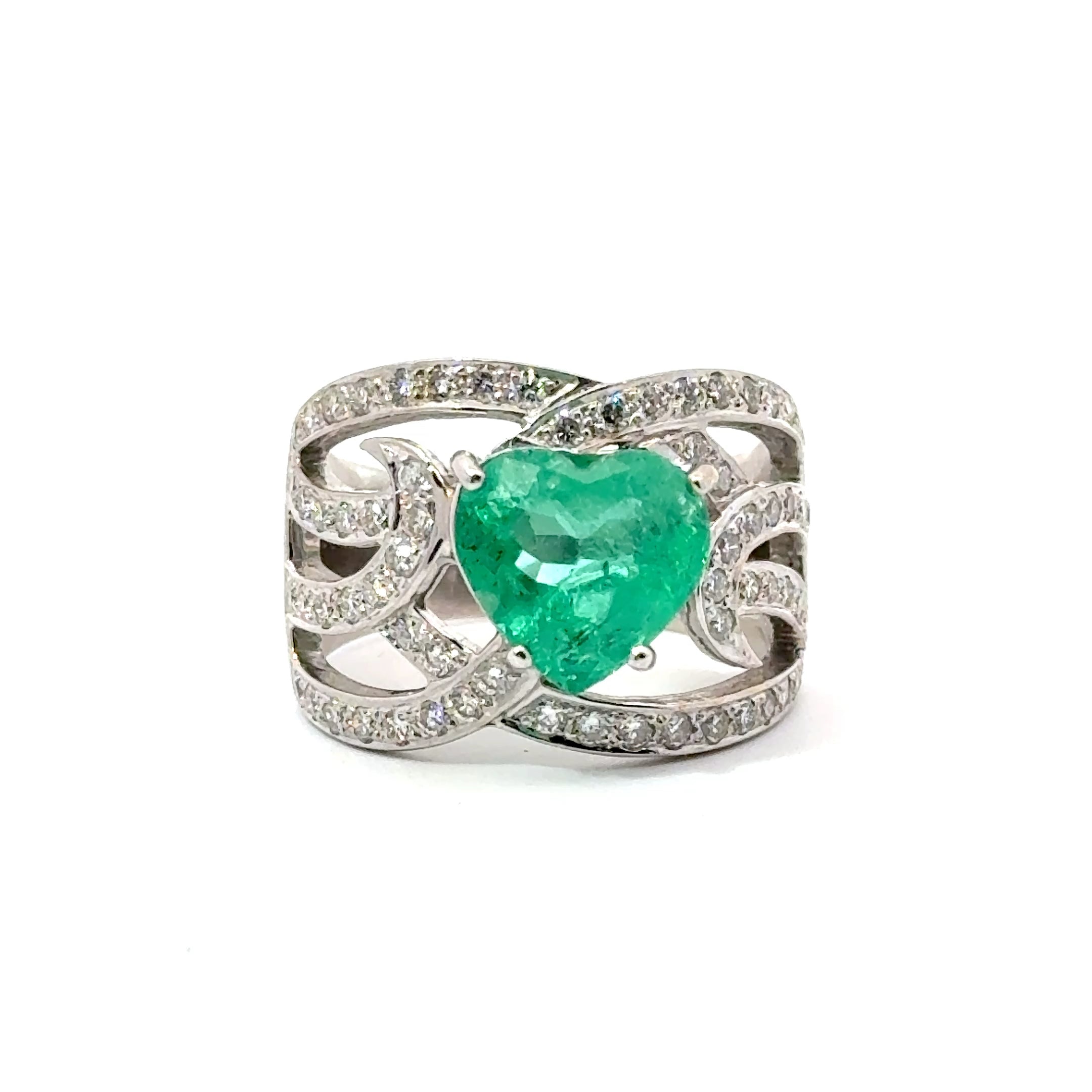 Make a bold and luxurious statement with this 18K White Gold Emerald Heart and Diamond Ring – a piece to treasure forever.