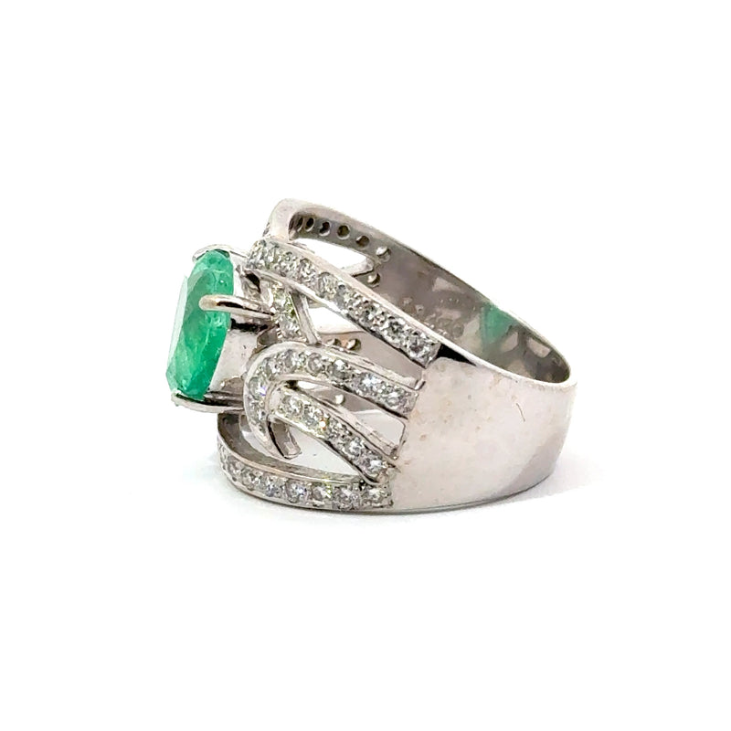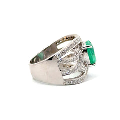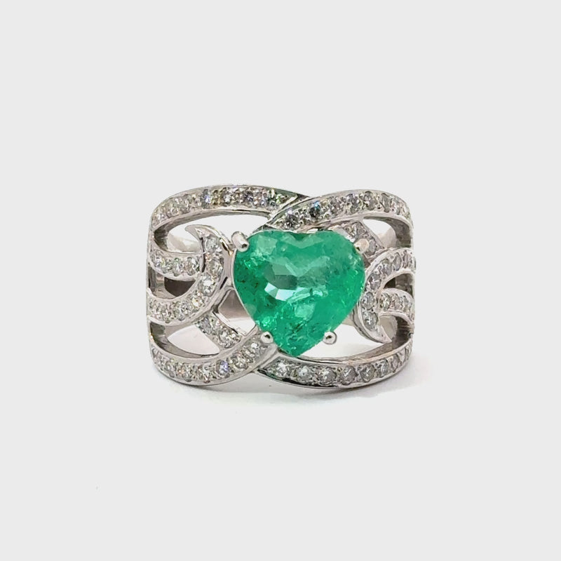 Indulge in luxury with this breathtaking 18K White Gold Emerald Heart and Diamond Ring. This elegant masterpiece combines the vibrant allure of emeralds with the timeless brilliance of diamonds, making it the perfect statement piece for any jewelry collection.
