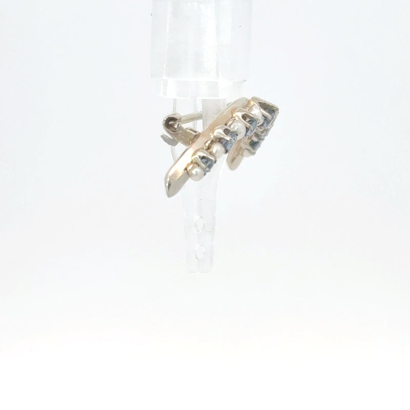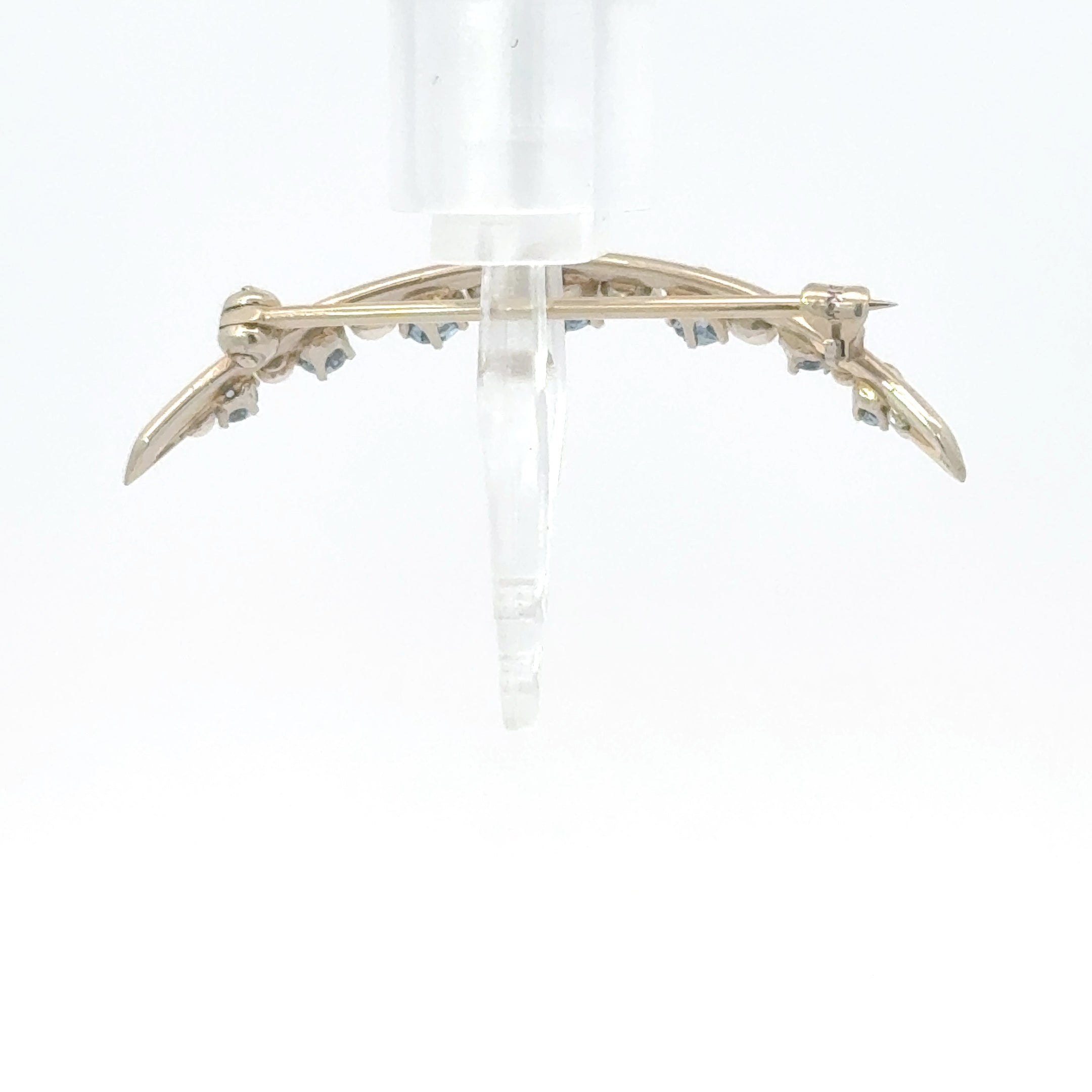 Add a touch of antique charm to your collection with this exquisite Half Moon Aquamarine and Pearl Brooch. Handcrafted in 18K gold, this brooch features a delicate design accented by the soft sparkle of aquamarine and the classic luster of pearls. Weighing 1.9 DWT, this brooch is lightweight yet durable, making it a stunning accessory for both formal and casual occasions.