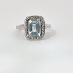 Add a touch of elegance to your jewelry collection with this breathtaking ring, featuring a 2-carat emerald-cut aquamarine framed by a dazzling diamond halo. This exquisite piece is crafted to perfection and radiates timeless beauty.